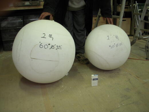 | 「東急ハンズ」や「世界堂」、「ユザワヤ」ほかいろんなところに探してもない!!! 店頭規格外の発泡スチロールによる「半球」および「球体」 町田美術工房がご用意します。 回転台による手作業での削り出し「球体」 最大1000o(それ以上も可) まずはお電話を!!! |